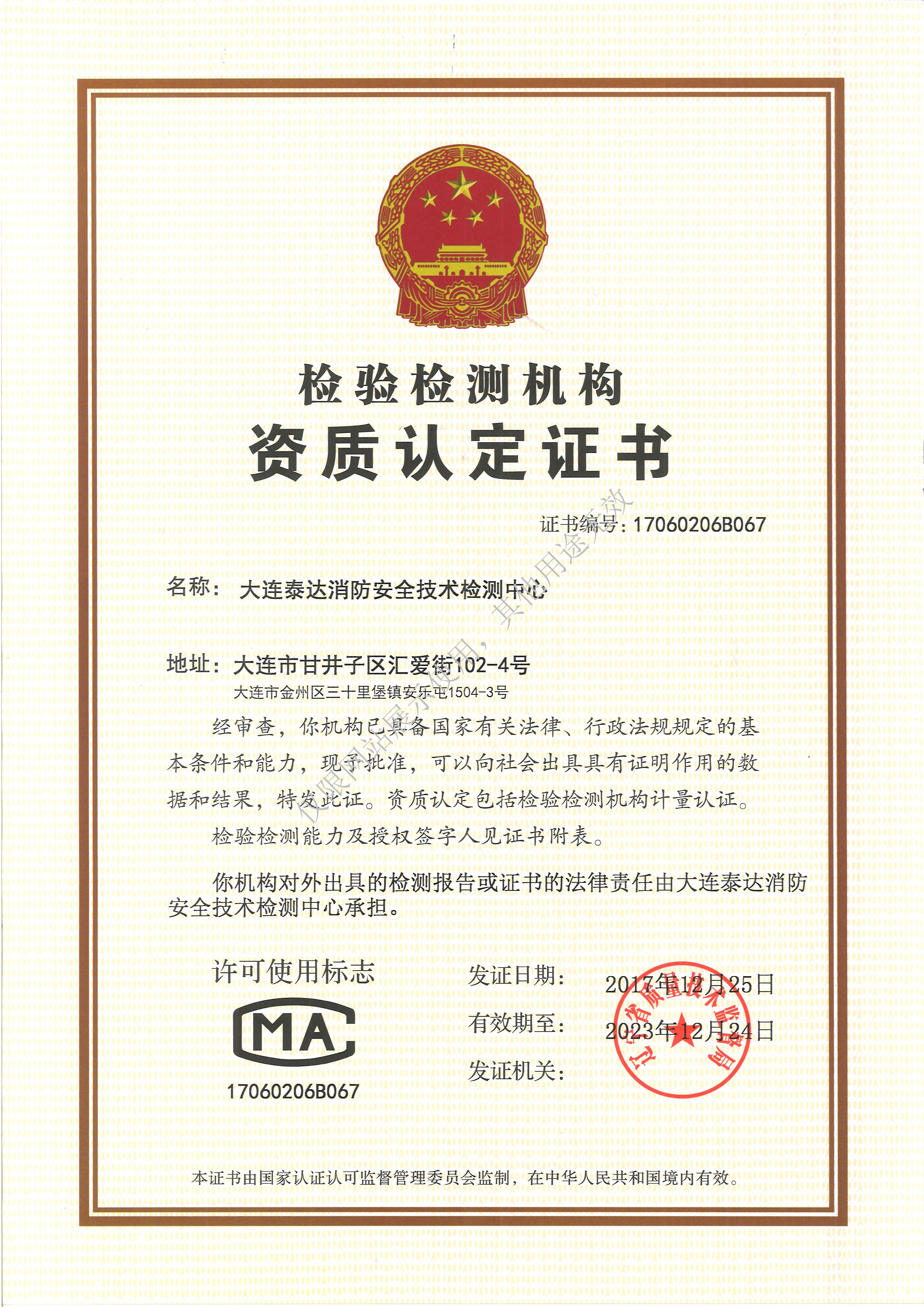 · 大連泰達消防安全技術(shù)檢測中心成立于2003年3月,是一家專注從事消防設(shè)施維護保養(yǎng)、消防設(shè)施檢測、電氣防火檢測、消防安全評估、雷電防護裝置檢測、防火涂料檢測、消防技術(shù)咨詢與消防培訓(xùn)等專業(yè)消防技術(shù)服務(wù)的企業(yè)。